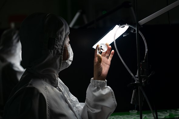 | A Sigma employee inspects finished elements before they’re installed into a lens and shipped to customers. This image was taken from our Sigma Aizu factory tour in 2019. |